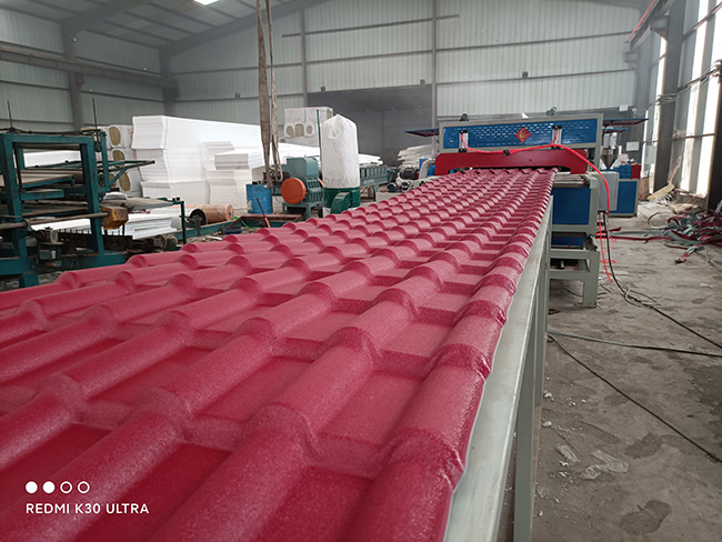 本合成樹脂瓦生產線主要用于PVC+ASA/PVC多層復合樹脂瓦、琉璃瓦的生產,規(guī)格有寬度880mm,1050mm,厚度2.5,3mm,節(jié)距220mm、250mm等等