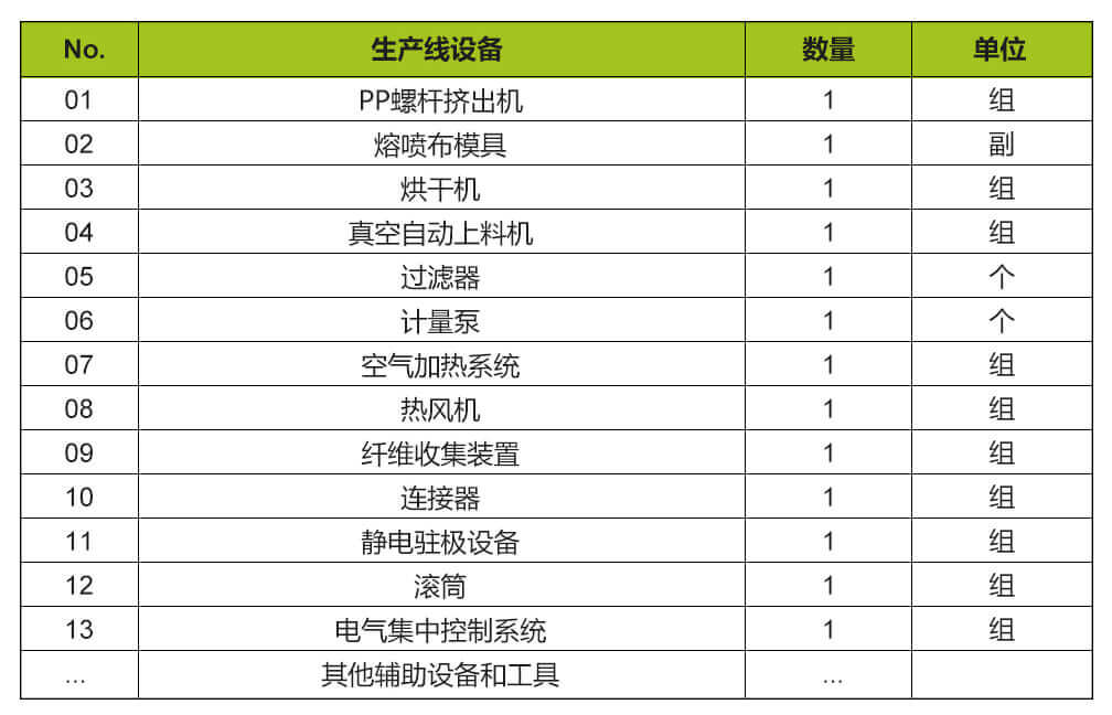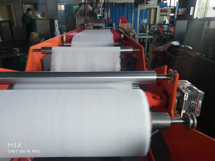 整體生產(chǎn)線采用熔噴法進(jìn)行生產(chǎn),具體指的是借助高速熱氣流使剛擠出的高聚物熔體迅速高倍拉伸固化成形的紡絲方法。熔噴法生成的無紡布纖維更細(xì),表面積更大,具有好的過濾性、屏蔽性、絕熱性和吸油性,這些是其他工藝生產(chǎn)的無紡布所不能比擬的。
